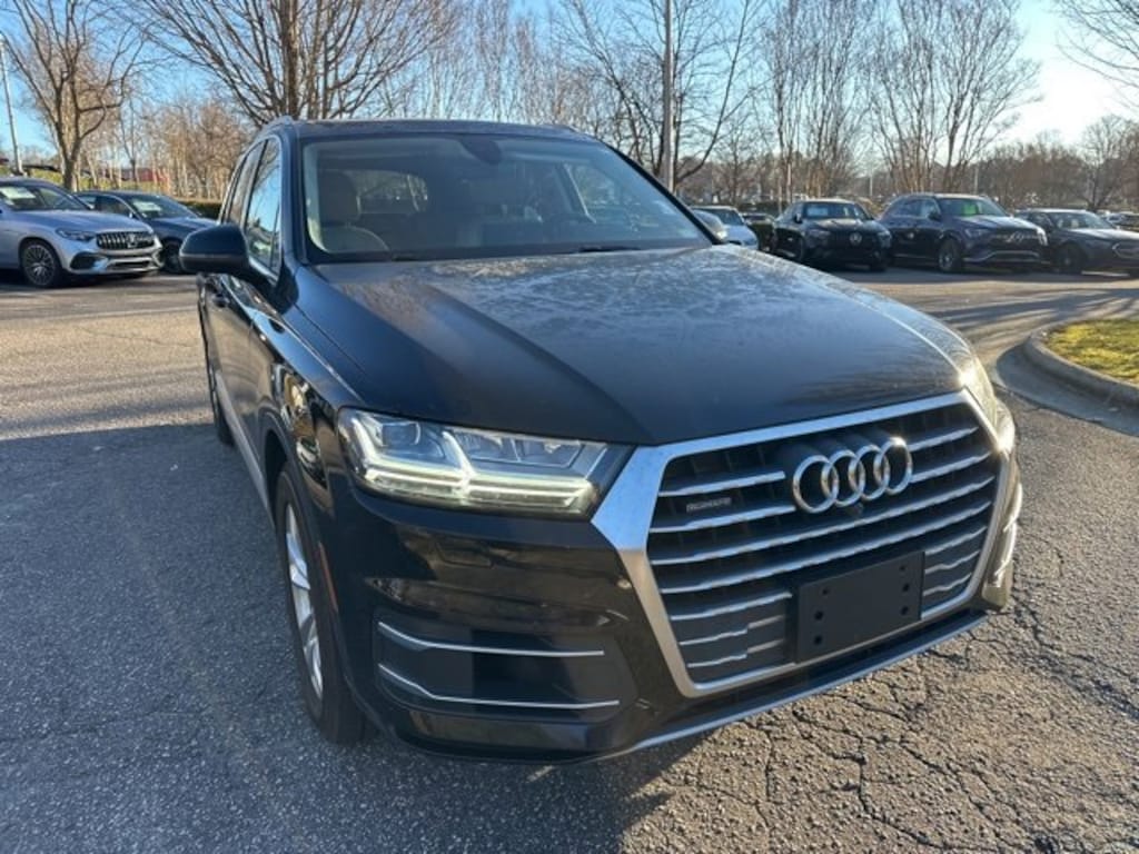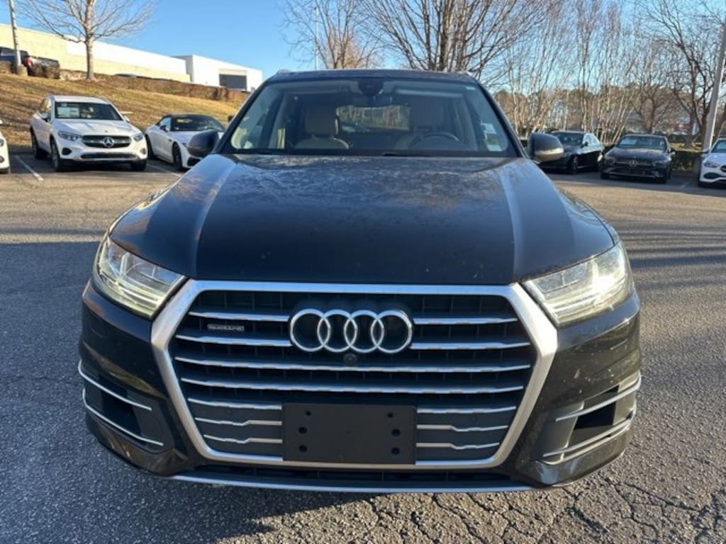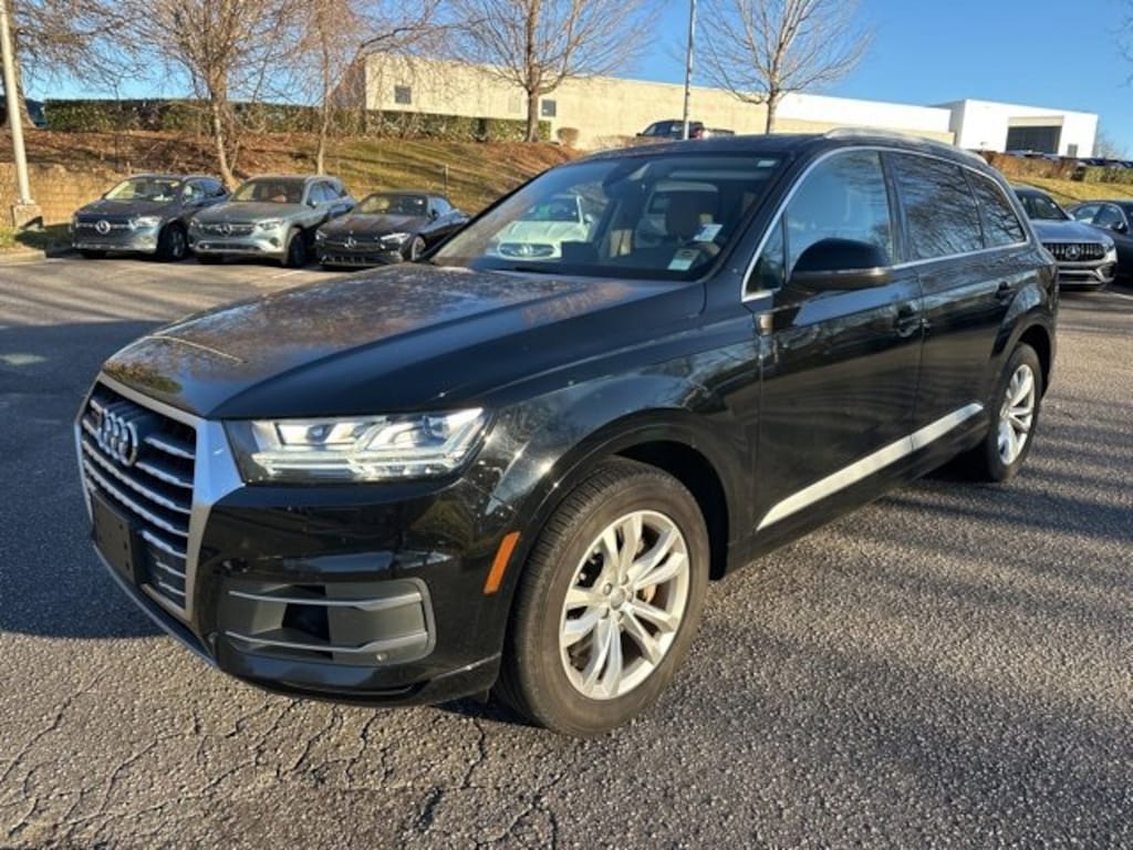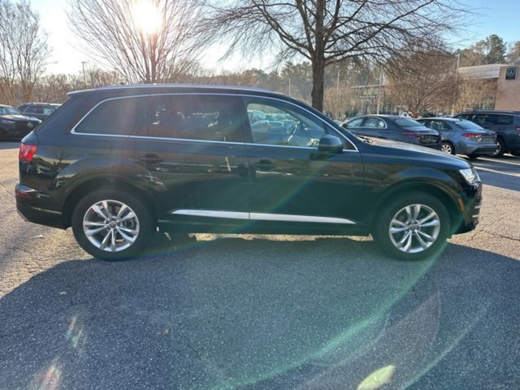Black 2019 Audi Q7 55 SE Premium Plus quattro 3.0L TFSI V6 DOHC 10 Speakers, 3.204 Axle Ratio, 3rd row seats: bench, 4-Wheel Disc Brakes, ABS brakes, Air Conditioning, Alloy wheels, AM/FM radio: SiriusXM, Audi smartphone interface (Apple CarPlay/Android Auto), Auto-dimming door mirrors, Auto-dimming Rear-View mirror, Automatic temperature control, Brake assist, Bumpers: body-color, CD player, Compass, Delay-off headlights, Driver door bin, Driver vanity mirror, Driver's Seat Mounted Armrest, Dual front impact airbags, Dual front side impact airbags, Electronic Stability Control, Emergency communication system: Audi connect CARE, Four wheel independent suspension, Front anti-roll bar, Front Bucket Seats, Front dual zone A/C, Front fog lights, Front reading lights, Fully automatic headlights, Garage door transmitter: HomeLink, Heated door mirrors, Heated Front Bucket Seats, Heated front seats, Illuminated entry, Leather Seating Surfaces, Leather Shift Knob, Leather steering wheel, Low tire pressure warning, Memory seat, Navigation system: MMI Navigation plus, Occupant sensing airbag, Outside temperature display, Overhead airbag, Panic alarm, Passenger door bin, Passenger seat mounted armrest, Passenger vanity mirror, Power door mirrors, Power driver seat, Power Liftgate, Power moonroof, Power passenger seat, Power steering, Power windows, Radio data system, Radio: Audi MMI Navigation Plus, Rain sensing wipers, Rear air conditioning, Rear anti-roll bar, Rear fog lights, Rear reading lights, Rear seat center armrest, Rear window defroster, Rear window wiper, Remote keyless entry, Roof rack: rails only, Security system, Speed control, Speed-sensing steering, Split folding rear seat, Spoiler, Steering wheel memory, Steering wheel mounted audio controls, Tachometer, Telescoping steering wheel, Tilt steering wheel, Traction control, Trip computer, Turn signal indicator mirrors, Variably intermittent wipers, Wheels: 20" 10-Spoke-Star Design Bi-Color.