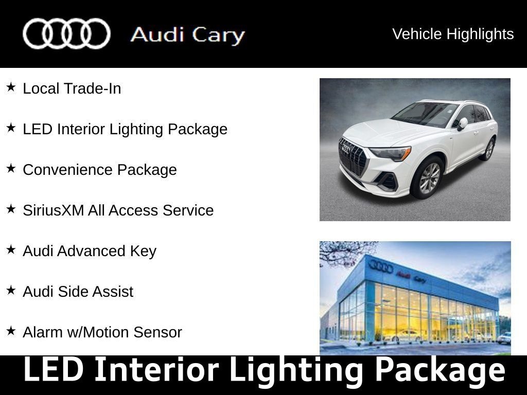 Ibis White 2021 Audi Q3 Premium S Line quattro 8-Speed Automatic with Tiptronic 2.0L 4-Cylinder TFSI quattro Clean CARFAX. Local Trade-In, Alarm w/Motion Sensor, Audi Advanced Key, Audi Parking System Plus, Audi Side Assist, Convenience Package, Frameless Auto-Dimming Interior Mirror w/Compass, Heated Power-Folding Exterior Mirrors, LED Interior Lighting Package, SiriusXM All Access Service.