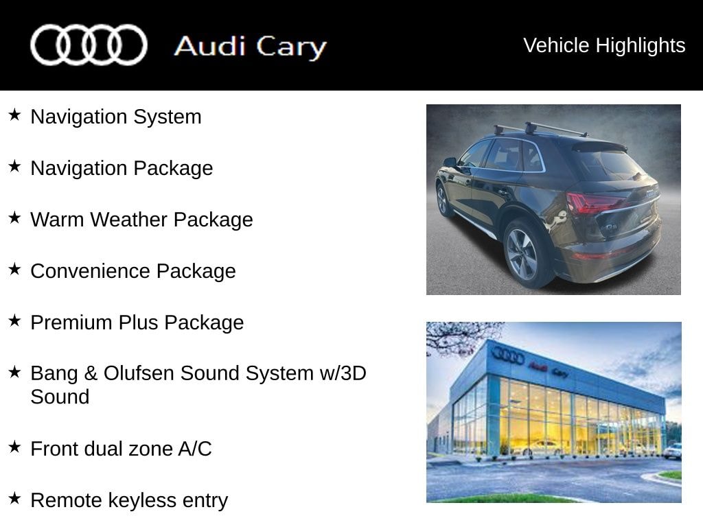 New Price! Mythos Black Metallic 2023 Audi Q5 40 Premium Plus quattro 7-Speed Automatic S tronic 2.0L Turbocharged quattro CARFAX One-Owner. Clean CARFAX. Black w/Leather Seating Surfaces, ABS brakes, Alloy wheels, Audi Active Lane Assist, Audi Connect PLUS, Audi MMI Navigation Plus, Audi Virtual Cockpit Plus, Bang & Olufsen Sound System w/3D Sound, Compass, Convenience Package, Electronic Stability Control, Front dual zone A/C, Hands-On Detection Steering Wheel, Heated door mirrors, Heated front seats, Illuminated entry, Leatherette Covered Center Console & Door Armrests, Low tire pressure warning, Manual Rear Side Window Sunshades, Navigation Package, Navigation System, Panoramic Sunroof, Power Adjustable Steering Column, Power Liftgate, Premium Plus Package, Remote keyless entry, Top View Camera System, Traction control, Traffic Jam Assist, Ventilated Front Sport Seats w/4-Way Power Lumbar, Warm Weather Package, Wheels: 19" 5-Arm-Pylon Design w/Matte Finish.