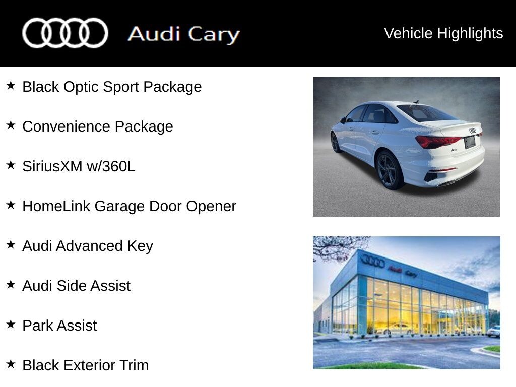 Glacier White 2024 Audi A3 40 Premium FrontTrak 7-Speed Automatic S tronic 2.0L 4-Cylinder TFSI FrontTrak CARFAX One-Owner. Clean CARFAX. Santos Brown/Steel Gray Stitching w/Leather Seating Surfaces, Audi Advanced Key, Audi Side Assist, Auto-Dimming Power Folding Exterior Mirrors, Auto-Dimming Rear-View Mirror, Black Exterior Trim, Black Optic Sport Package, Convenience Package, HomeLink Garage Door Opener, Memory for Driver's Seat, Park Assist, SiriusXM w/360L, Sport Suspension (-15 mm), Wheels: 18" 5-Double-Spoke-V Design, Wireless Phone Charging Pad.