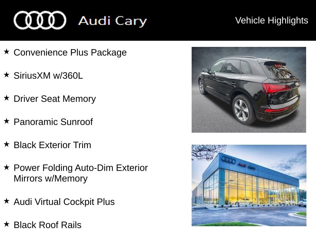 Mythos Black Metallic 2025 Audi Q5 40 Premium quattro 7-Speed Automatic S tronic 2.0L Turbocharged quattro CARFAX One-Owner. Clean CARFAX. Black w/Leather Seating Surfaces, Audi Virtual Cockpit Plus, Black Exterior Trim, Black Roof Rails, Convenience Plus Package, Driver Seat Memory, Panoramic Sunroof, Power Folding Auto-Dim Exterior Mirrors w/Memory, SiriusXM w/360L, Wheels: 19" 5-Arm-Pylon Design w/Matte Finish.