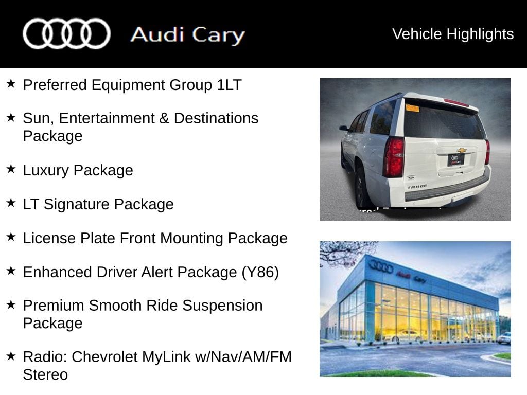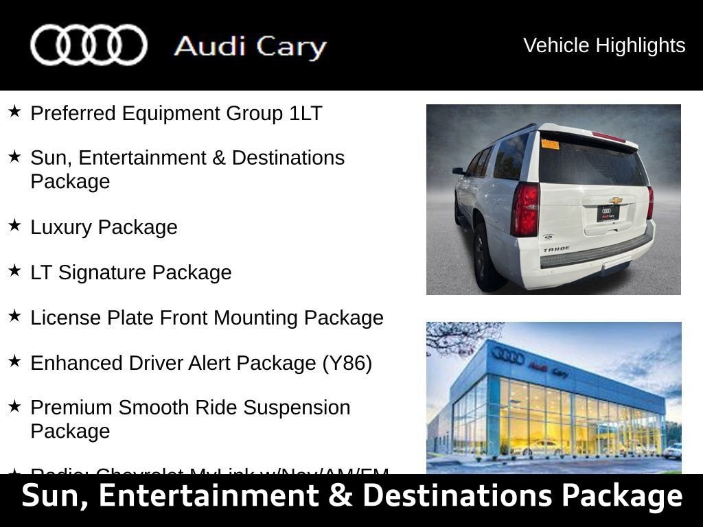 Summit White 2017 Chevrolet Tahoe LT 6-Speed Automatic Electronic with Overdrive EcoTec3 5.3L V8 4WD 4WD, Black Leather, 1st & 2nd Row Color-Keyed Carpeted Floor Mats, 2nd Row 60/40 Split-Folding Manual Bench, 2nd Row Pwr Release 60/40 Split Folding Bench Seat, 3rd Row 60/40 Power Fold Split-Bench, 3rd Row Manual 60/40 Split-Folding Fold Flat Bench, 4-Wheel Antilock Disc Brakes w/Brake Assist, Auto-Dimming Inside Rear-View Mirror, Black Assist Steps, Bose Premium 9-Speaker System, Bright Bodyside Moldings, Chrome Assist Step Kit (LPO), Chrome Recovery Hooks, Color-Keyed Carpeting Floor Covering, Driver Inboard & Front Passenger Airbags, Electronic Cruise Control w/Set & Resume Speed, Enhanced Driver Alert Package (Y86), Enhanced Driver Information Center, Extended-Range Remote Keyless Entry, Floor Console, Fog Lamps, Forward Collision Alert Sensor Indicator, Front & Rear Parking Assist, Grille Insert (LPO), Hands Free Power Liftgate, Heated 2nd Row Seats, Heated Leather Wrapped Steering Wheel, IntelliBeam Headlamps, Lane Keep Assist, Leather-Wrapped Steering Wheel, License Plate Front Mounting Package, Low Speed Forward Automatic Braking, LT Signature Package, Luxury Package, Memory Settings, OnStar Basic Plan For 5 Years, Passive Entry System, Polished Exhaust Tip, Power Liftgate, Power Sunroof, Power Tilt & Telescopic Steering Column w/Memory, Power-Adjustable Accelerator & Brake Pedals, Power-Folding Heated Outside Mirrors, Preferred Equipment Group 1LT, Premium Smooth Ride Suspension Package, Push Button Keyless Start, Radio: Chevrolet MyLink w/Nav/AM/FM Stereo, Rear Cross-Traffic Alert, Rear Park Assist w/Audible Warning, Rear Seat Blu-Ray/DVD Entertainment System, Remote Vehicle Start, Roof-Mounted Luggage Rack Side Rails, Side Blind Zone Alert w/Lane Change Alert, SiriusXM Satellite Radio, Sun, Entertainment & Destinations Package, Universal Home Remote, Wheels: 20" x 9" Chrome, Wireless Charging.