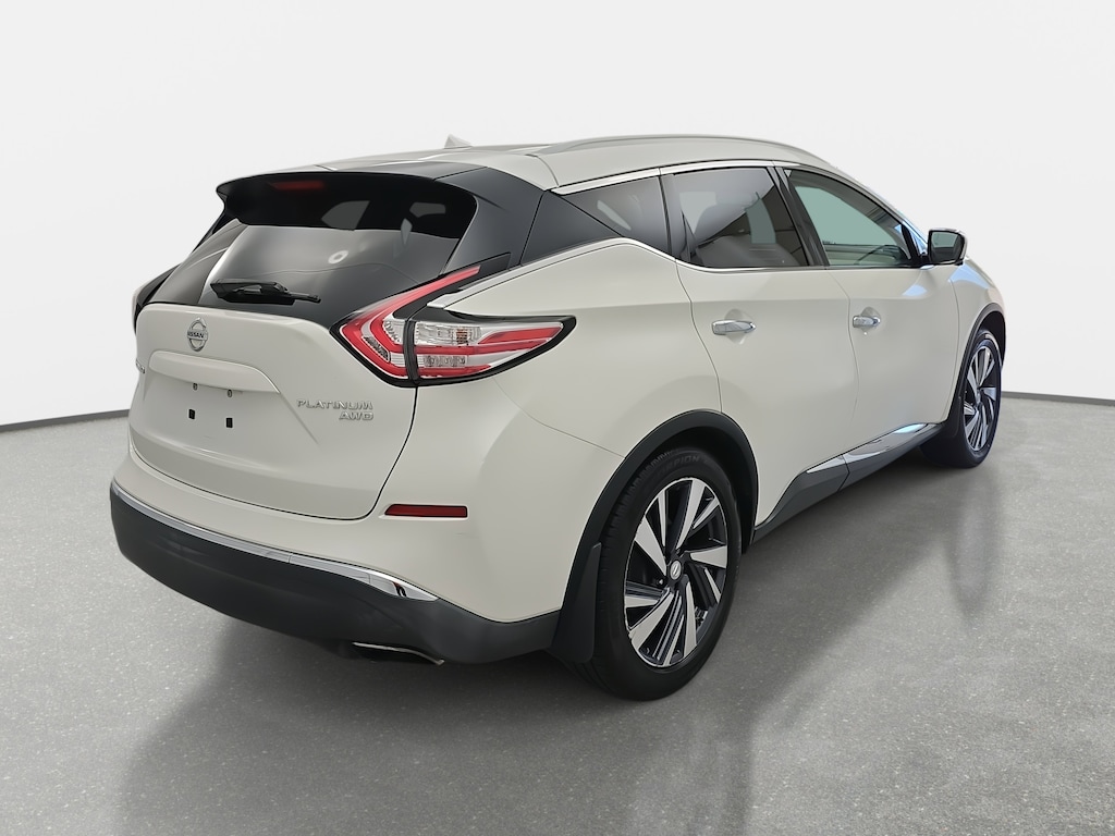 White 2015 Nissan Murano Platinum AWD CVT with Xtronic 3.5L V6 DOHC CVT with Xtronic, AWD, Brake assist, Fully automatic headlights, Garage door transmitter: HomeLink, Heated front seats, Heated rear seats, Memory seat, Power driver seat, Power Liftgate, Radio: AM/FM/CD Audio System w/Navigation, Rear window wiper, Ventilated front seats, Wheels: 20" Machined Aluminum-Alloy.